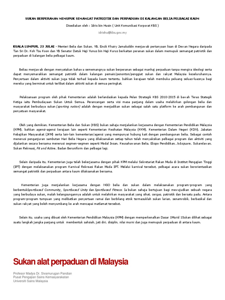 Contoh Karangan Sukan Sebagai Alat Perpaduan - 12 1 1 peranan sukan sebagai alat perpaduan dan keharmonian kaum sejarah tahun 6 malaysia di persada sukan.